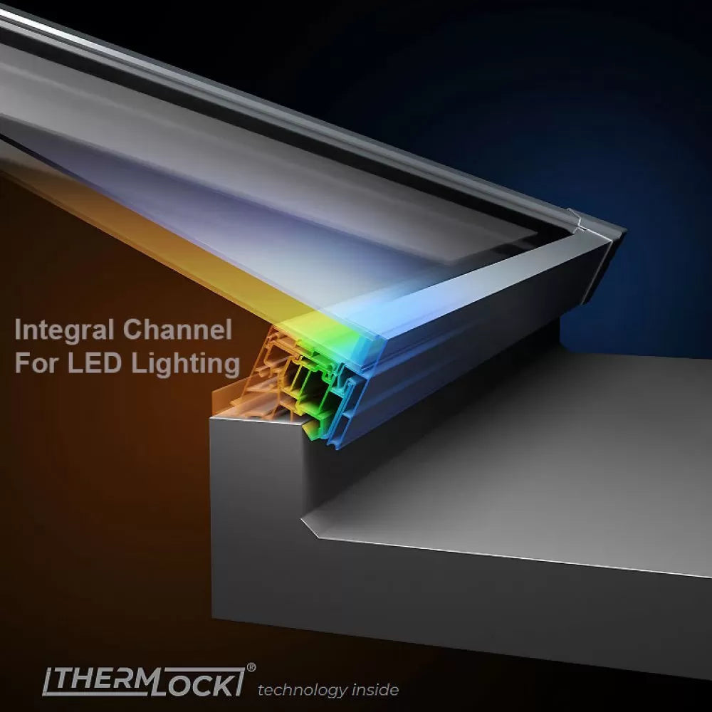 65% thermisch efficiënter dan conventionele aluminium daksystemen. Elk element van de lichtstraat of dakraam heeft een ultra-laag geleidend element dat de binnen- en buiten aluminium lagen scheidt. Dit helpt bij de isolatie en bespaart daarmee ook energiekosten.