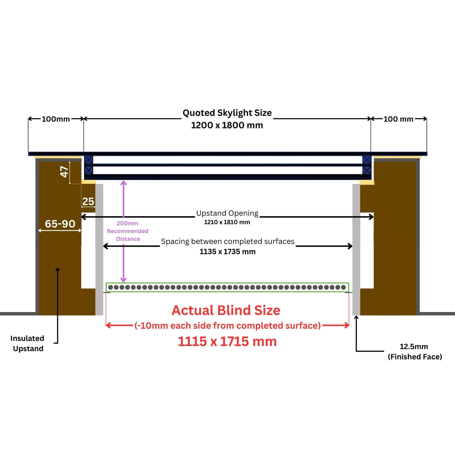 Veuillez noter que nos stores disponibles dans le commerce sont 85 mm plus petits que la taille sélectionnée. En supposant que vous ayez construit votre puits de lumière selon nos recommandations, il s'agit de tenir compte de la latte en bois (25 mm) et des plaques de plâtre (12,5 mm) de chaque côté, laissant ainsi un espace de 10 mm pour que le store puisse s'insérer.